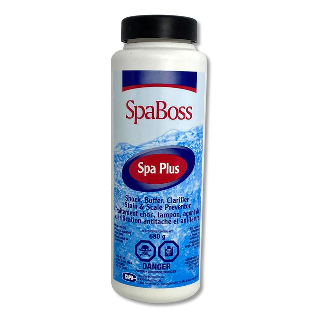 SpaBoss Spa Plus is a Shock, Buffer, Clarifier, and Stain and Scale preventor. It superchlorinates by oxidizing organic material, and produces sparkling clear water with no cloudy residue. Spa Plus contains 34% available chlorine, and also allows you to “shock and soak” within 15 minutes of use.